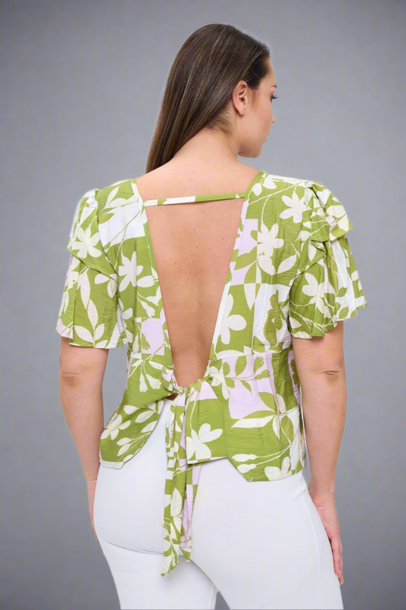 This is a Hawaiian-inspired blouse featuring a bold green and white floral print with tropical vibes. It has short puff sleeves with a layered ruffle detail, and the standout feature is its dramatic open-back design. The back plunges deeply into a V-shape, held together by a thin strap across the upper back and a tie closure at the waist for an adjustable fit. The lightweight, textured fabric adds a breezy, casual feel, making it perfect for summer outings, beach vacations, or tropical evenings.