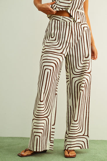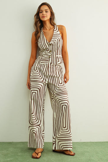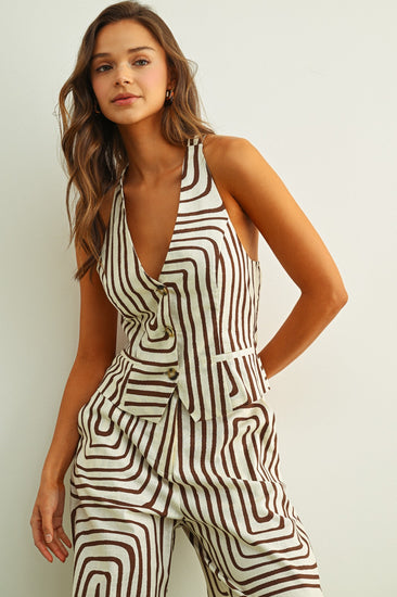 Effortlessly chic and modern, the Desert Abstract Linen Set is a statement-making two-piece designed for warm, sun-soaked days. Featuring a tailored sleeveless vest with a flattering V-neckline and button-front closure, paired with high-waisted wide-leg pants, this set blends structure with relaxed comfort. The bold geometric pattern in earthy tones adds a contemporary edge, while the breathable linen fabric keeps it light and airy. Perfect for brunch dates, vacation strolls, or elevated casual wear.