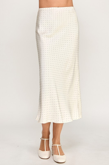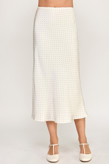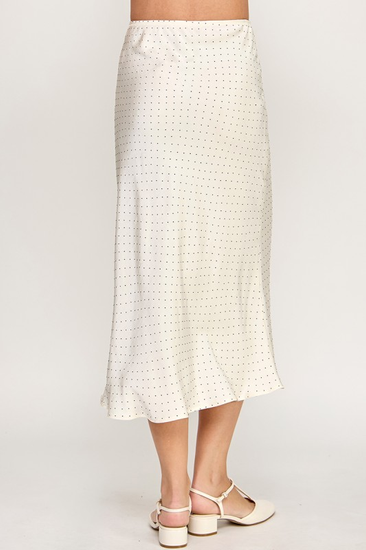Chic and playful, the Dotted Harvest Skirt features a crisp white base adorned with subtle black dots, adding a modern twist to a classic silhouette. Its flowing shape pairs beautifully with cozy sweaters, cardigans, or layered tops, creating a versatile and stylish fall-ready look.