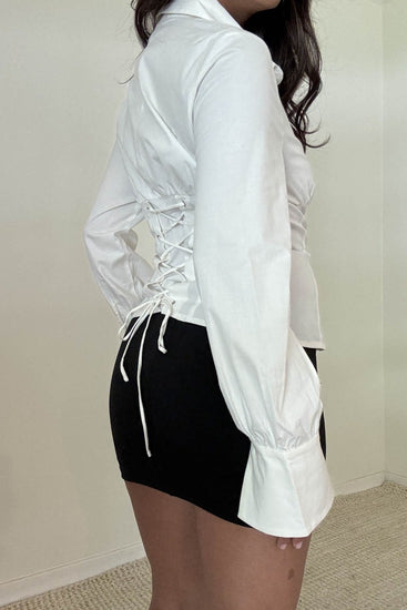 Meet the white button-up that does more than the basics. This blouse blends classic tailoring with a feminine silhouette, featuring a structured corset-style lace-up back that gently cinches the waist for the most flattering fit. Designed to elevate your everyday wardrobe, this piece brings effortless sophistication whether styled with denim, trousers, or a sleek maxi skirt.