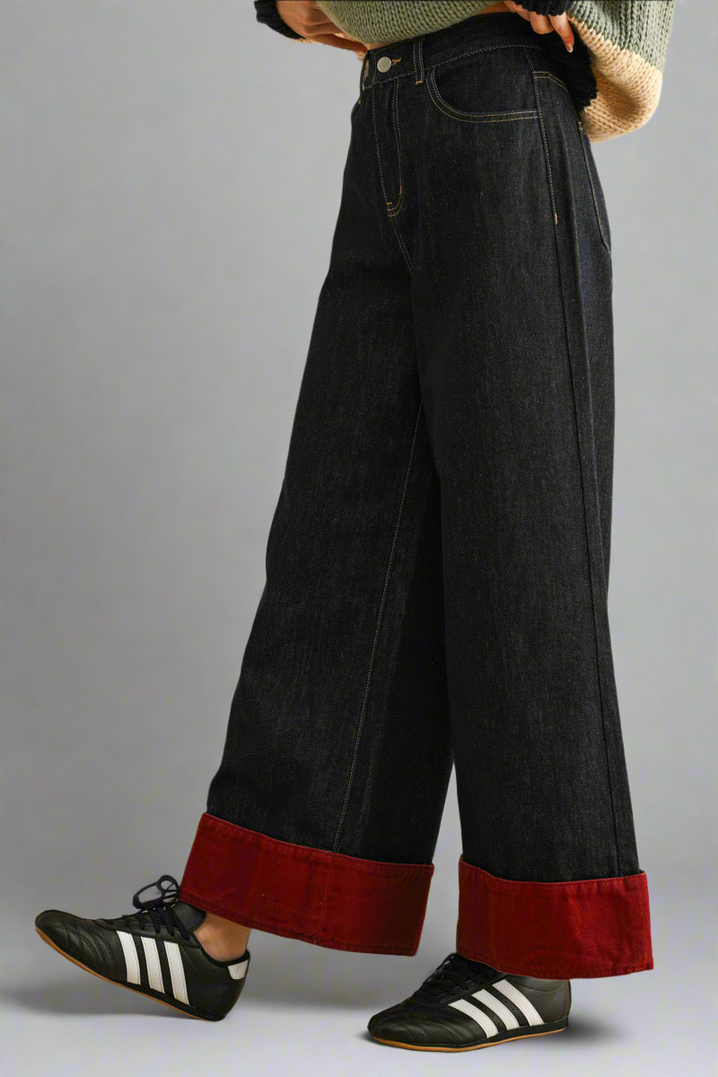 Step into statement style with the Crimson Edge Wide-Leg Jeans. Featuring a relaxed, wide-leg silhouette and eye-catching red contrast cuffs, these jeans blend effortless comfort with a pop of bold color. The high-rise fit flatters while the cuffed hem adds a playful, modern twist perfect for fall layering. Pair with chunky boots and a cozy sweater for a look that’s equal parts edgy and casual-chic. These jeans are your new go-to for turning heads all season long